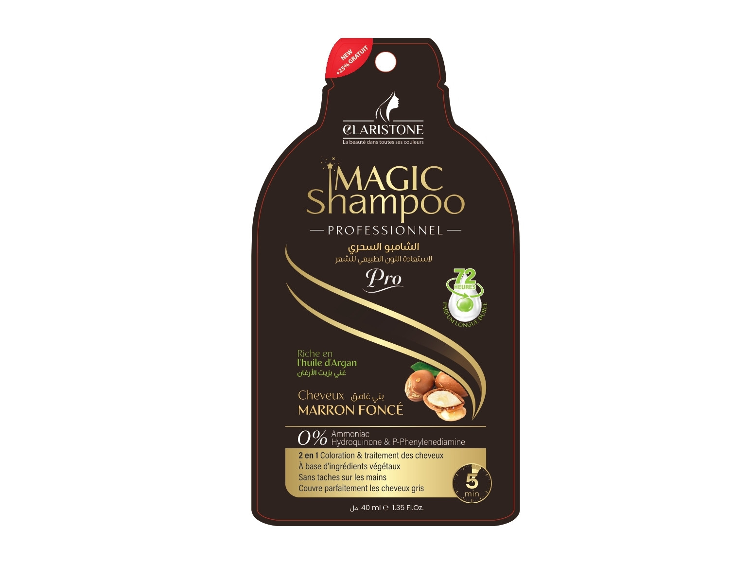 Le shampoing magic de claristone teint et soigne les cheveu en même temps sans laisser de trace sur les mains , Contiens des huiles essentielles qui protége complétement la chevelure des racines jusqu’aux points et permet aussi de les revitalisé et leur donnent douceur, brillance et une odeur sensorielle. Après la coloration, les cheveux deviennent soyeux, souple et naturels pour une longue durée.